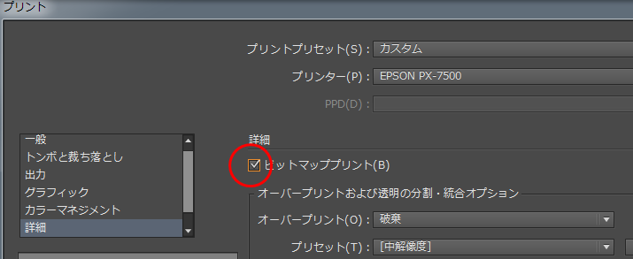 詳細設定で”ビットマッププリント”にチェックを。(イメージデータにして出力)