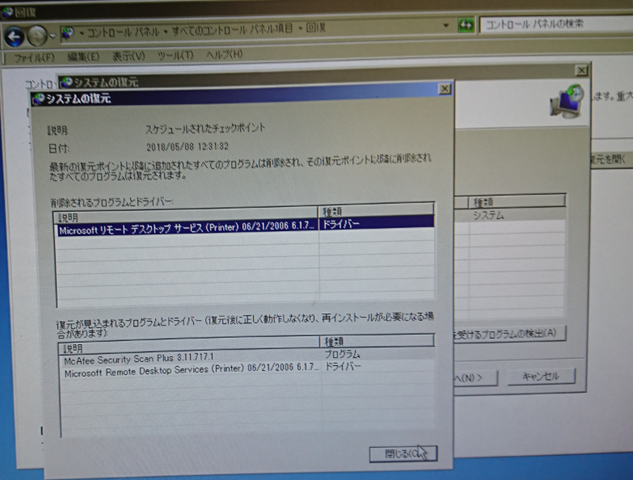 Windowsには、「パソコンを以前の状態に復元する」ことができるので、その機能を使いました。ウィルスや得体のしれないシステムを変更された場合は、その変更をされる前の状態にパソコンを戻せば大丈夫なのです。