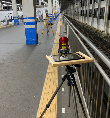 自動追尾TSなのでポイント出しは一人で行いました。後で巻き尺で距離間チェックをしていきましたが、ほとんど2mm以内でできていましたね。