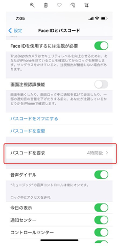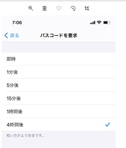 5) パスコードを要求内でロックがかかるまでの時間が選べるますので、自分の好きな時間を