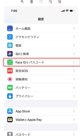 2)設定画面をスクロールして 『FaceIDとパスコード』を