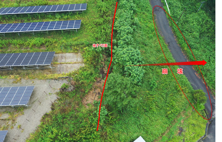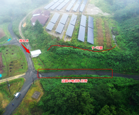 背面亀裂より後方に太陽光発電パネルが見受けられますが、これにより少なからず水の流れ方が変わっているとは思いますが、今回崩壊しつつある斜面側に集中的に水が流れ込んだかは降雨時に現地確認して表面水の流れを確認するくらいしか方法はないでしょうね。