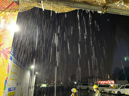 火曜日の晩には、こんな土砂降りのような雨の中、トータルステーションにこんなプラ板を取り付けて測量をやっていました。(夜間TSの写真を撮っていませんでしたので過去の)