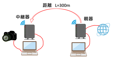 こんな感じに中継器を取り付けて、親機の電波を拾わせまして、300m離れた箇所でこのぐらいの通信スピードが出ました。
