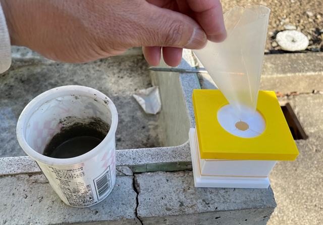 型枠に水と混ぜ合わせたモルタルを流し込み五分釘でバーブレーター代わりに締固めをします。