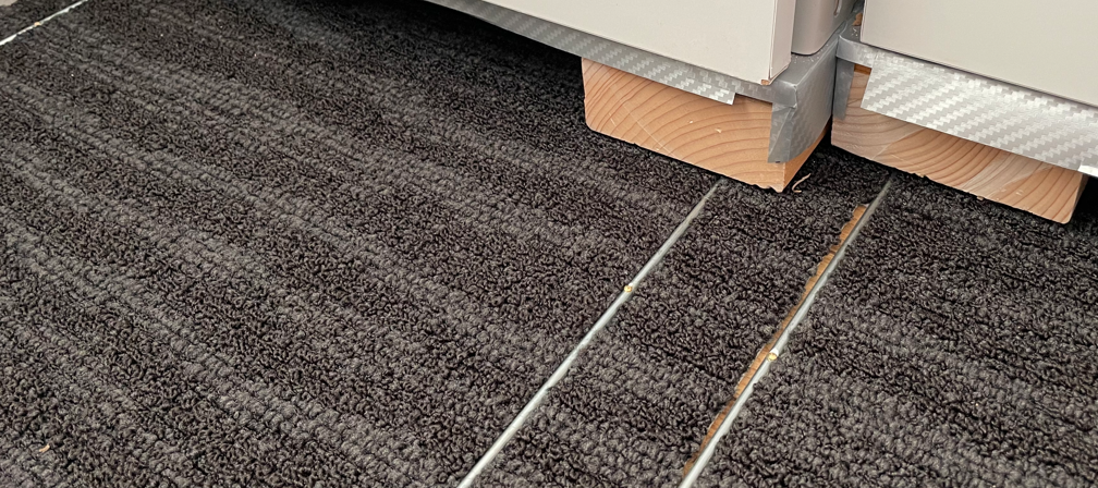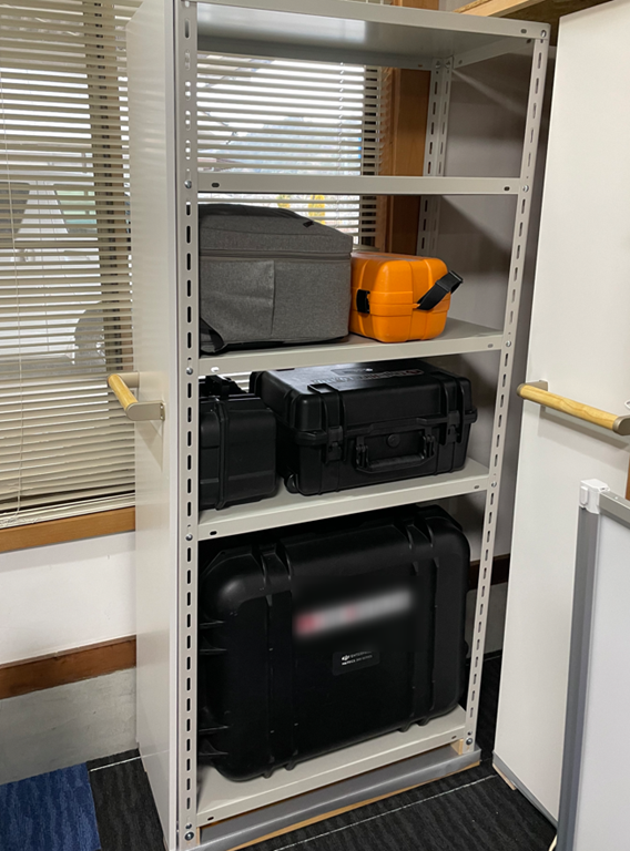 その中で収納場所を作っていたのは測量機・UAVの保管場所。これはタイルカーペットを張る前から作っていました。(測量機を外に出しておくことなんてできませんので)