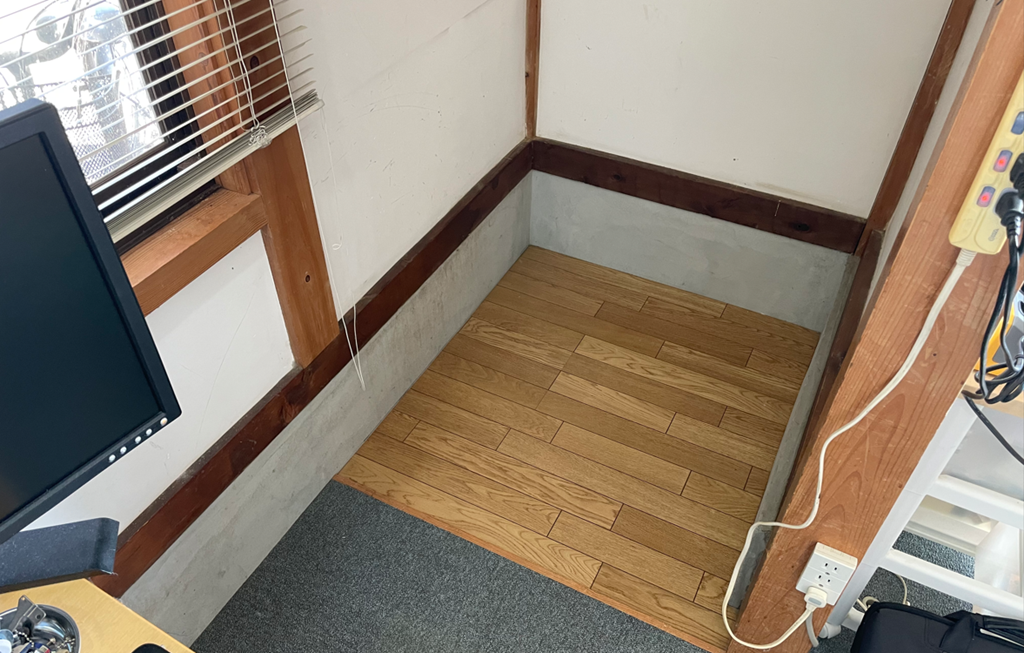 これまでは事務所の角の床に置いていましたが、ようやく整備しました。でも今の機材もぎりぎり入るように作っていますので、今後機材の形が変わると入らなくなってしまいますね。(苦笑)