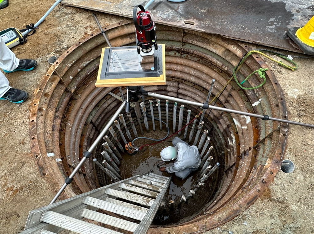 竪坑の上に”カメラ三脚+ガラス板”を据えて、その上に”レーザー墨出し器+360°プリズム”を付けた”もぐらスペシャル機”を置いて、トータルステーションから360°プリズムを観測して位置出しを行います。