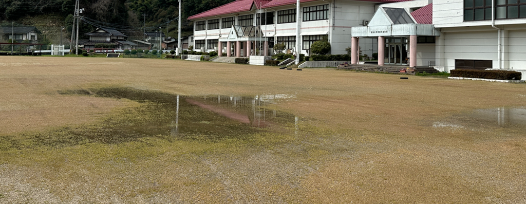 除草剤などを併用してグランド整備をしていますと、地盤が少しづつ沈下してきまして、数年前から水たまりが出来るようになり、草もどんどん育つ環境となっています。