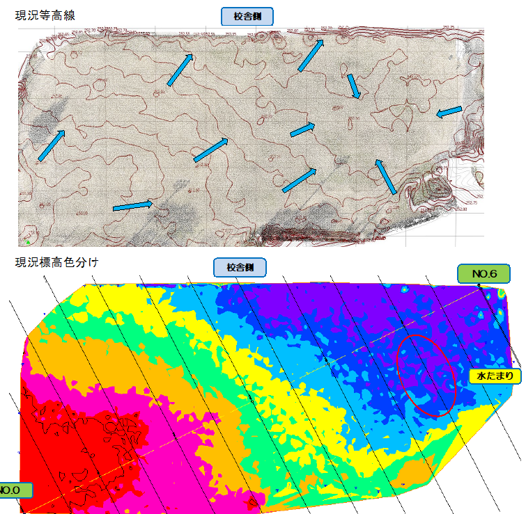 3)トータルステーションでグランド脇の水路高を計測