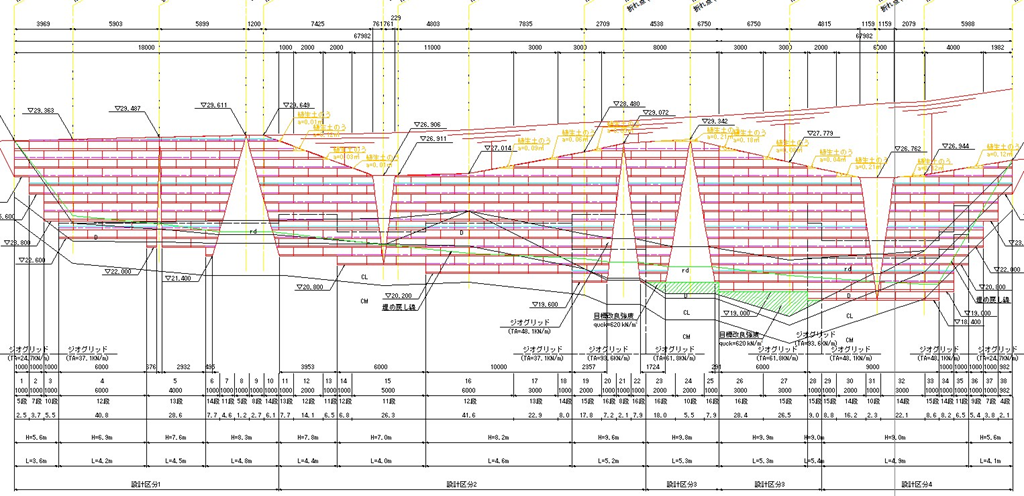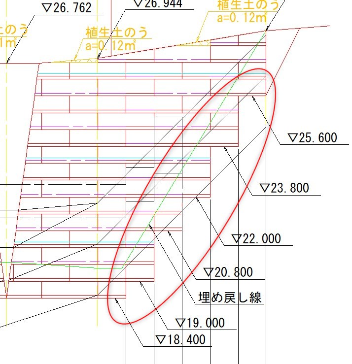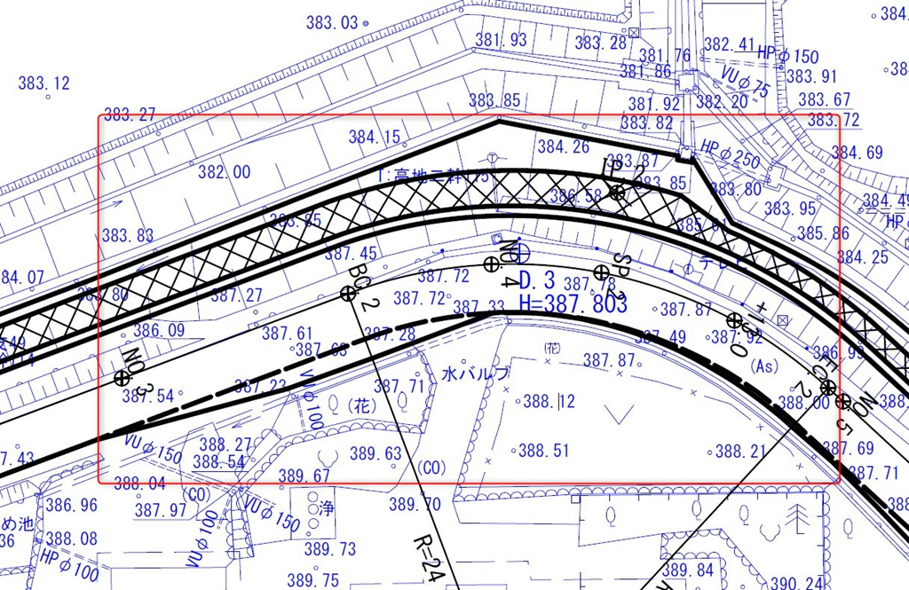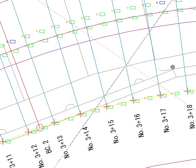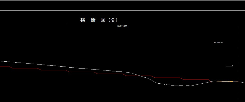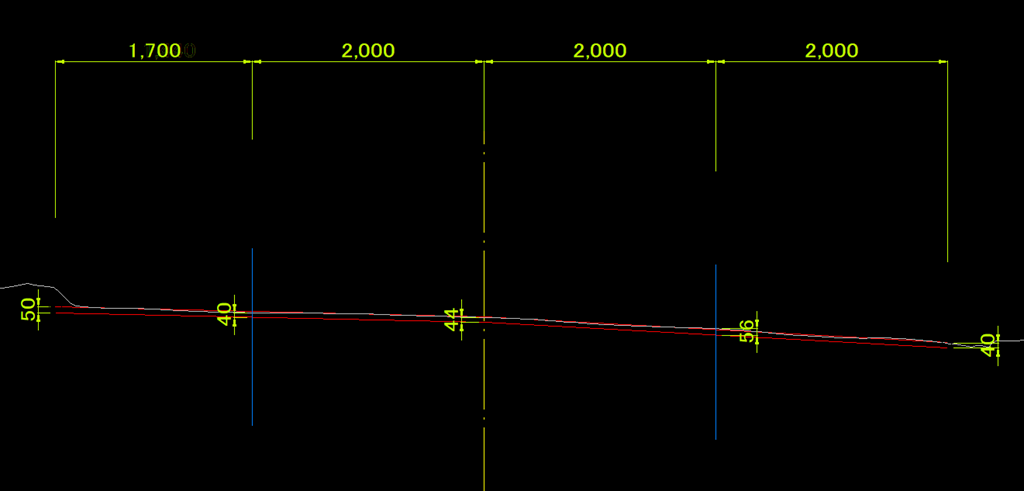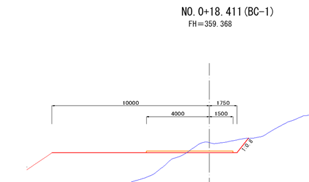 10m程度で現況と計画線の横断図より、切削厚さを横断図より算出します。