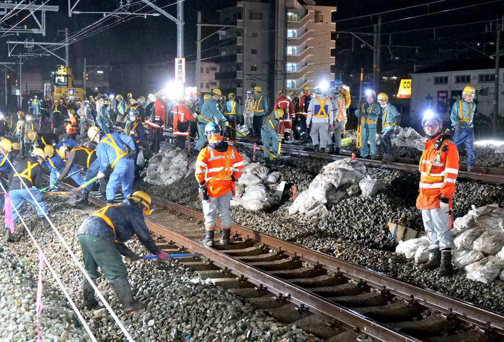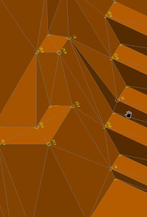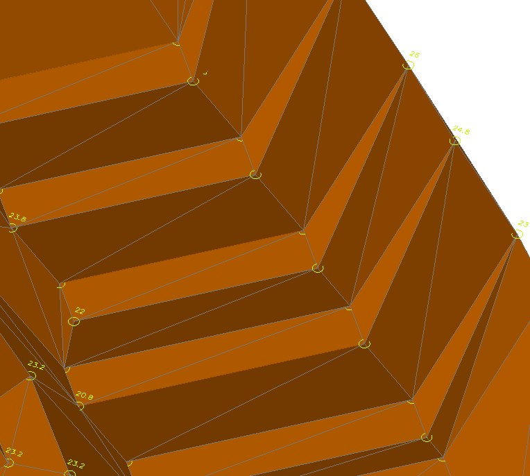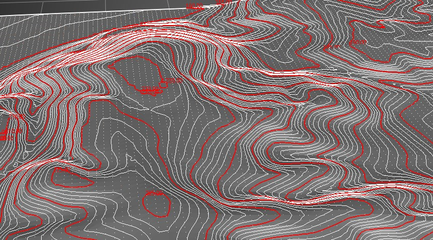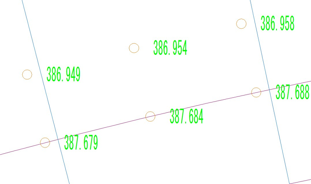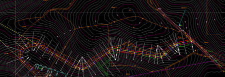 レーザー現況断面と設計データを一度に切り出して、計画線が現況に擦りつくように片勾配を計画します。
