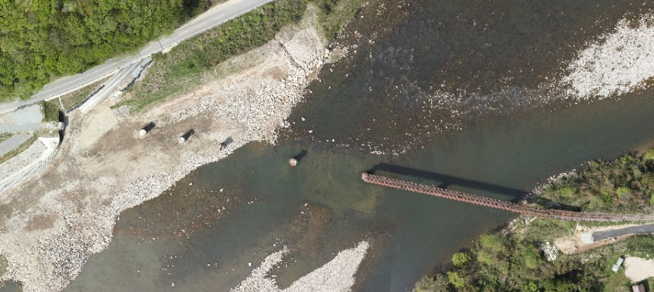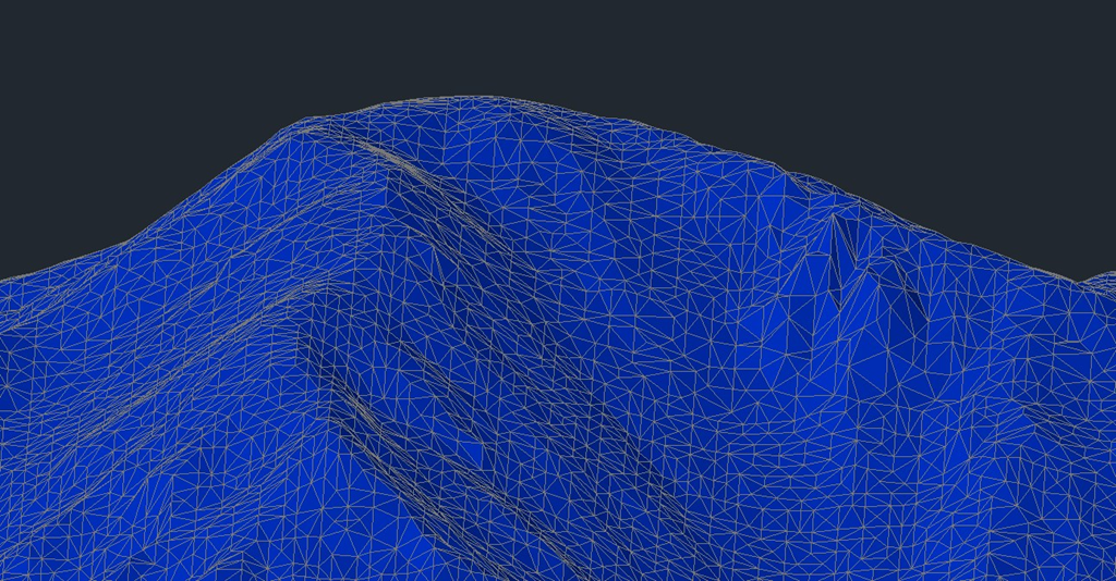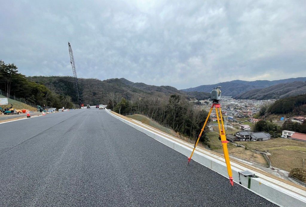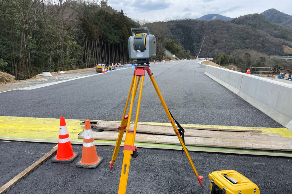 工事内容は約600mぐらいの道路の切削オーバーレイ工事。起工測量はレーザースキャナーで行い、そのデータにより、道路線形、縦断図、横断図を作成して計画を立てます。