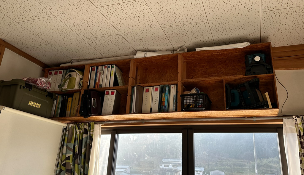 もともとここにはべニアで自作した本棚があったのですけど・・・事務所からファイルや本が消えてきまして、取り壊して棚になってしまいました。
