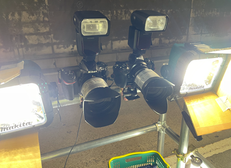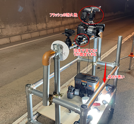 前回投稿したいた機材で実際の現場に行き撮影したのですが・・・撃沈。何とか撮影はしていましたが、取付金具・カメラ雲台・照明等何もかも強度不足の上、レンズの選択も失敗していて、ボロボロながら撮影していました。