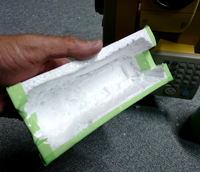 木製三脚にベルトで縛り、ケースをおもりにする。こうすることで、三脚を伸ばしTLSを高い位置に据えてもそれなりに振動をせずに計測できます。