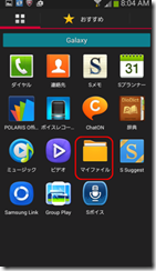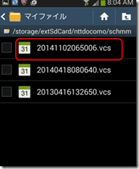 スマートフォンのアプリ(アイコン)の中に 「マイファイル」 → 「すべてのファイル」 → 「SDmemory card」 → 「nttdocomo」 → 「schmm」 → 本日付けの先ほど保存vcsファイルがあるかを確認します。(当日の日にちのファイル名が無かった場合はもう一度SDカードに保存するところら)