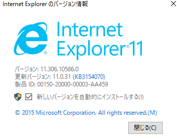 ちなみにバージョンは Internet Explorer 11 。これはWindows7を通常通りアップデートしてあったらIE11になっているはずです。