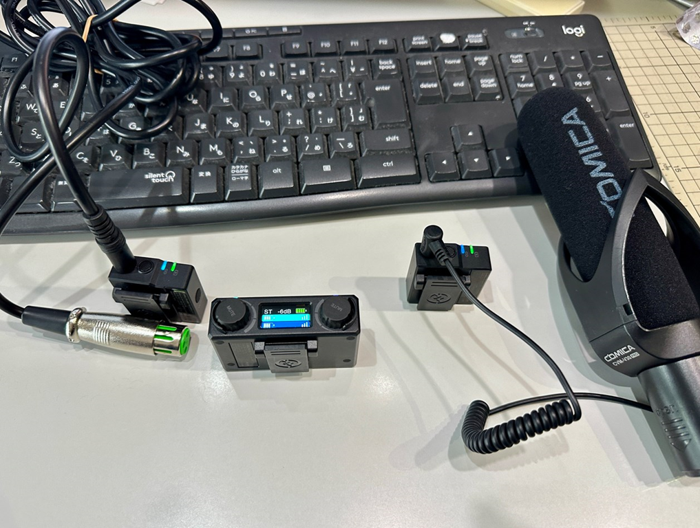 いろんな調整は必要となりますが、1回の充電で3時間ぐらい音声を100mぐらい送信してくれます。実はこの小さいほうの2つはマイクにもなりますので、そのままでも会話なども撮れます。
