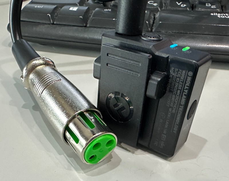 このような会場で使う”ミキシング”装置。マイクや音源を一元に管理する機械なのですが、そこから出力端子に(緑色のジャック)を差し込み、四角い小さな黒い装置は、無線機。